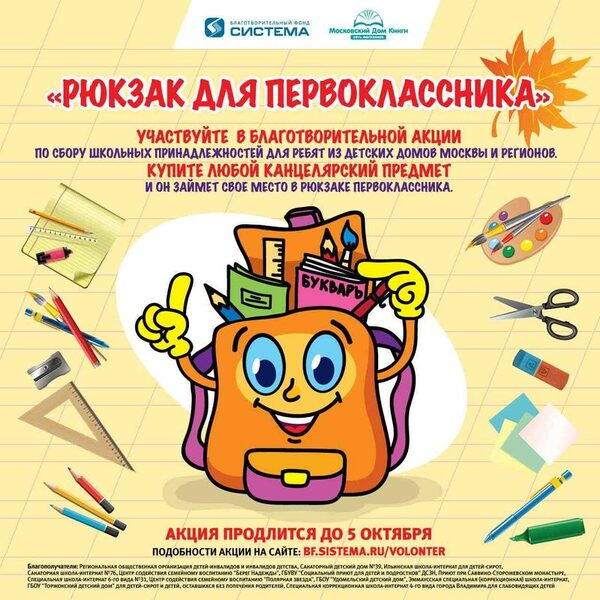 К началу нового учебного года по инициативе Благотворительного фонда «Система» и «Московского Дома книги» стартует волонтерская акция «Рюкзак для первоклассника» по сбору школьных принадлежностей для воспитанников детских домов Москвы и Московской области.
