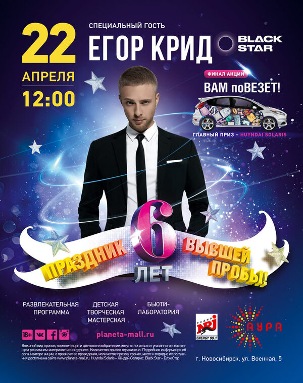22 апреля ТРЦ «АУРА» приглашает жителей Новосибирска на грандиозный праздник в честь своего шестого Дня Рождения. В этот день гостей торгового центра ждут розыгрыш автомобиля Hyundai Solaris, показы модных коллекций и насыщенная развлекательная программа! Главным событием дня станет большой живой концерт хедлайнера проекта, популярного молодежного исполнителя Егора Крида.