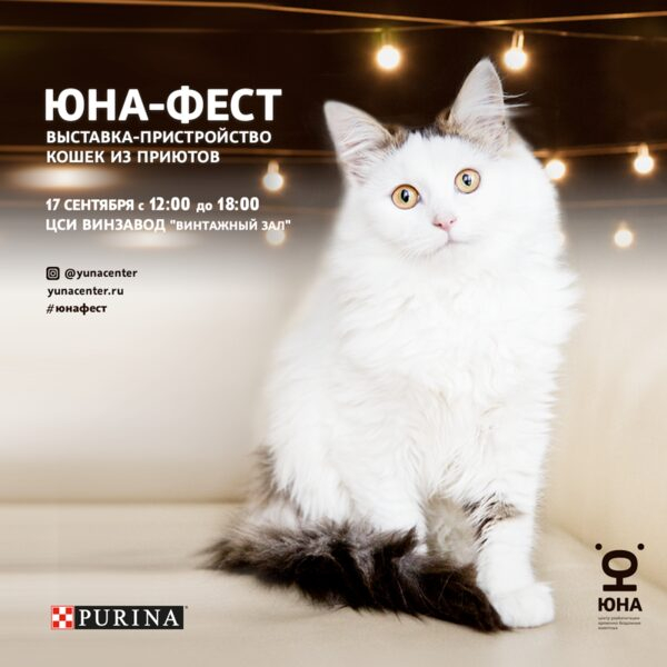 17 сентября на территории Центра современного искусства «Винзавод» состоится благотворительная выставка кошек из московских приютов – «Юна-Фест». Организаторы мероприятия – центр реабилитации временно бездомных животных «Юна» и бренд кормов для домашних животных PURINA® – хотят показать, что питомцы из приюта такие же добрые и ласковые, как и их породистые собратья, и они не меньше заслуживают нашей любви и заботы.