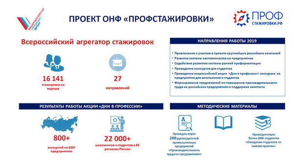 Общероссийский народный фронт совместно с АНО «Россия – страна возможностей» реализуют проект «Профстажировки». В основу проекта заложен новый механизм взаимодействия студента, образовательной организации и будущего работодателя, задействующий в качестве социального лифта студенческие работы и стажировки.