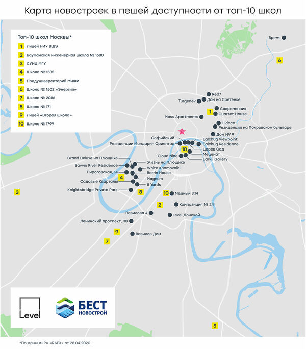 Выбор хорошей школы для большинства семей является принципиальным вопросом, мотивирующим подчас даже к переезду. Поэтому наличие возле ЖК престижного образовательного учреждения является важным фактором при выборе проекта. Девелоперская компания Level Group и БЕСТ-Новострой проанализировали московский рынок первичного и вторичного жилья и определили, какие проекты расположены в пешеходной доступности (в радиусе 1,5 км) от лучших школ.