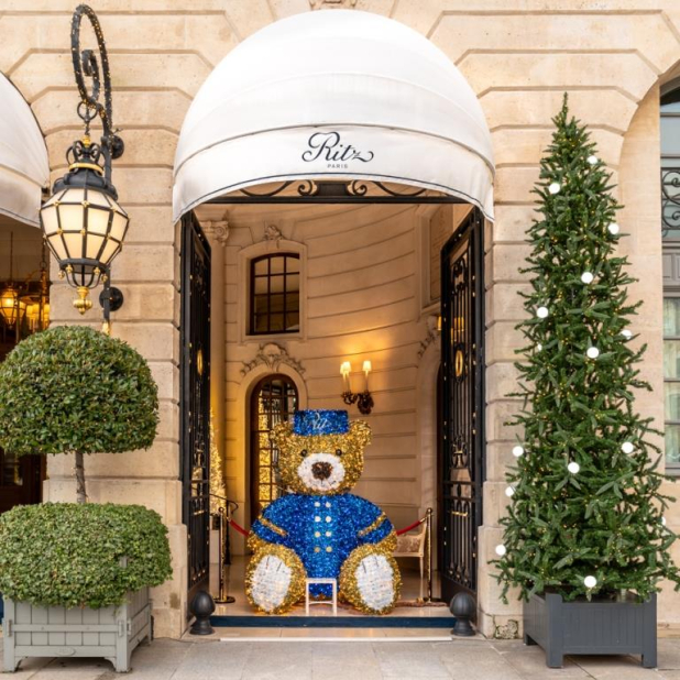 У входа гостей встречает гигантский плюшевый мишка в фирменной синей ливрее и кепи-таблетке швейцара, украшенный светодиодными лампочками, - новый зимний талисман отеля Ritz Paris. Праздничное настроение создает красавица-ель, установленная в лобби отеля перед парадной лестницей. В этом году она оформлена в белой, золотой и синей цветовой гамме. За декорации отвечала бессменный флорист Ritz Paris Энн Витчен, которая создала в отеле настоящую сказку - это и зимние композиции из альпийского эдельвейса, и миниатюрная железная дорога с движущимся поездом на радость детям, и новогодние сани в чайной гостиной Salon Proust, и светящийся олень на террасе Vendome.