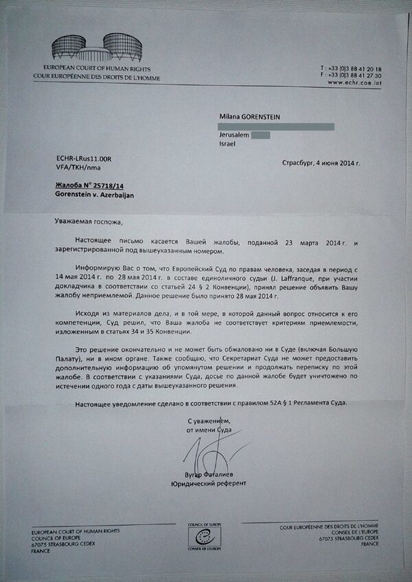 Получен ответ от Европейского Суда по Правам ЧеловекаВ конце июня был получен ответ из Европейского Суда по Правам Человека (ЕСПЧ) по жалобе Миланы Горенштейн на фальсификацию президентских выборов в Азербайджанской Р ...