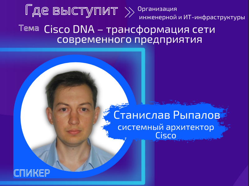Спикер ИТ - форума Рыпалов Станислав с темой "Cisco DNA – трансформация сети современного предприятия"В рамках секции «Организация инженерной и ИТ-инфраструктуры» выступит спикер от компании Cisco - Рыпалов Станислав с докладом об архитектуре цифровых сетей Cisco DNA ...