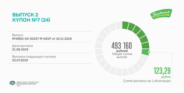 «ГрузовичкоФ» выплатил доход за 7-й купонный период по второму выпуску облигацийСегодня транспортная компания выплатила владельцам биржевых облигаций серии БО-П02 свыше 493 тыс. руб. Расчет проводился по ставке 15% годовых, установленной на ...