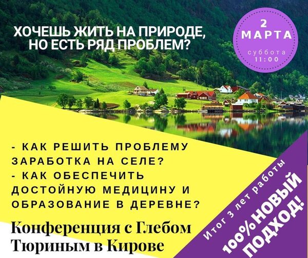 Конференция «Локальная экономика Кировской области. О возрождении сельских поселений» с Глебом Тюриным2 МАРТА 2019 года в субботу в Кирове пройдет конференция «Локальная экономика Кировской области. О возрождении сельских поселений» с Глебом Тюриным. Спикер ко ...