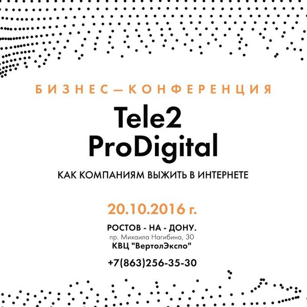 20 октября бизнес-конференция «Tele2 ProDigital»20 октября в КВЦ ВертолЭкспо состоится крупнейшая бизнес-конференция «Tele2 ProDigital». Как правильно использовать интернет? Как измерять и оценивать эффективнос ...