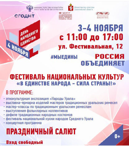 Фестиваль национальных культур «В единстве народа – сила страны!» в Екатеринбурге3 и 4 ноября на площадке Свердловского государственного областного Дворца народного творчества пройдёт фестиваль национальных культур «В единстве народа – сила стран ...