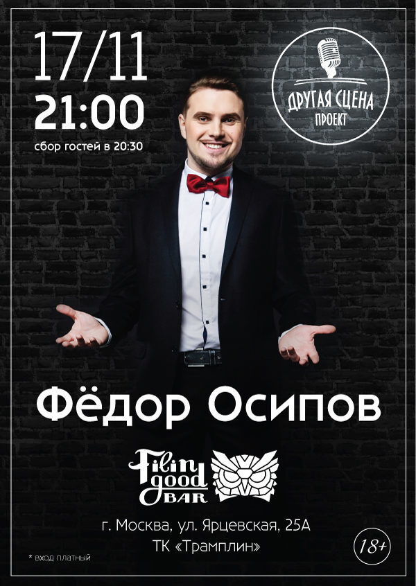 Концертная программа «Другая сцена Фёдора Осипова»17 ноября 2018 года в 21:00 в барном пространстве «Filin Good» (г. Москва, ул. Ярцевская, д. 25А, ст. м. Молодежная) в рамках проекта «Другая сцена» состоится сольны ...