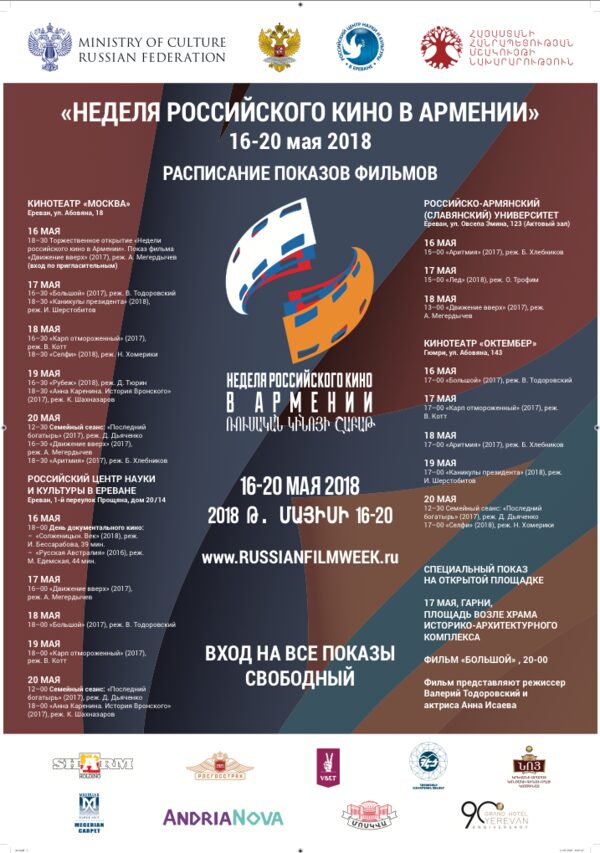 Неделя российского кино в АрменииРоссийско-армянское некоммерческое культурное мероприятие «Неделя российского кино в Армении» пройдет в Республике Армения c 16 по 20 мая 2018г. в городах (населенн ...