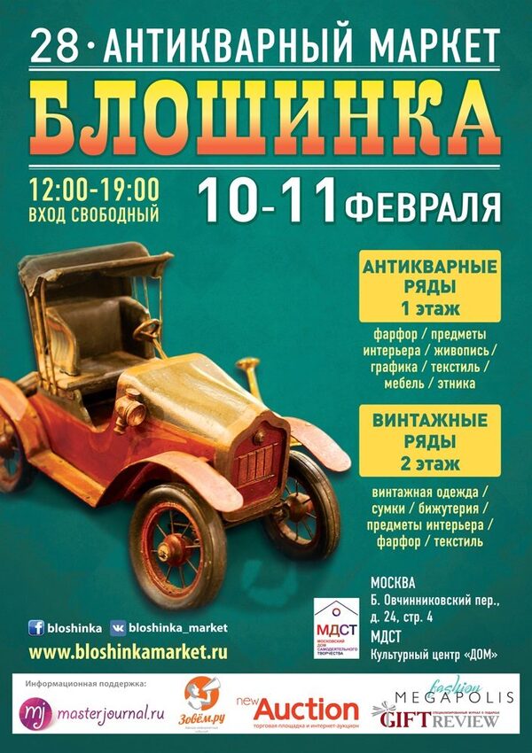 28-й Антикварный маркет «Блошинка»28-й Антикварный маркет «Блошинка» Время проведения: 10 и 11 февраля 2018 г 12:00 - 19:00. Место проведения: Москва, Большой Овчинниковский пер, 24, стр. 4. ...