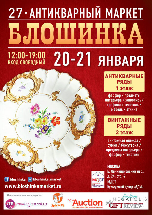 27-й Антикварный маркет «Блошинка»Сезон охоты за сокровищами открыт. 27-й Антикварный маркет «Блошинка» пройдет 20-21 января в центре Москвы 20-21 января 2018 года, с 12:00 до 19:00. Вход сво ...