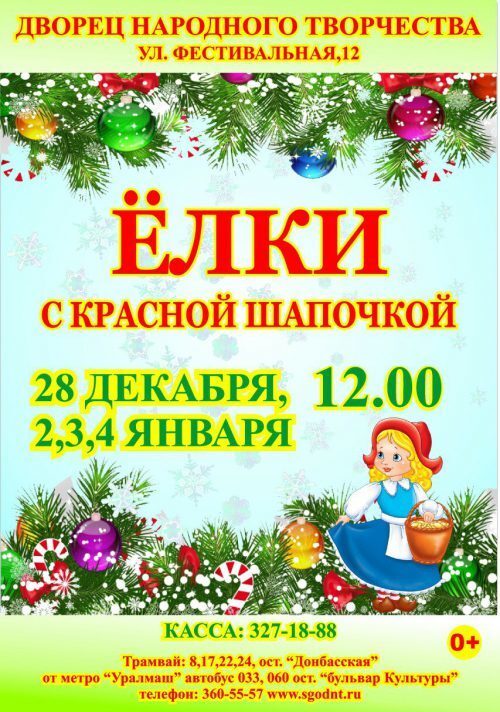 Свердловский государственный областной дворец народного творчества приглашает на новогодние елки!В большом празднично оформленном концертном зале Дворца детей ждут увлекательные приключения и забавы. Вместе с Красной Шапочкой они примут участие в подготовке ново ...