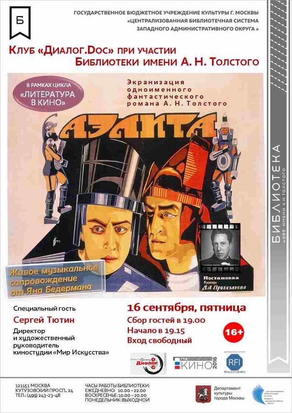 Открытие IV сезона Клуба документального кино «Диалог.doc». "Аэлита". Немой фильм Якова ПротазановаКлуб документального кино "Диалог.doc" Открывает IV сезон в Библиотеке им. А.Н. Толстого! Три года в одной из самых по-домашнему уютных библиотек города Клуб "Диалог ...