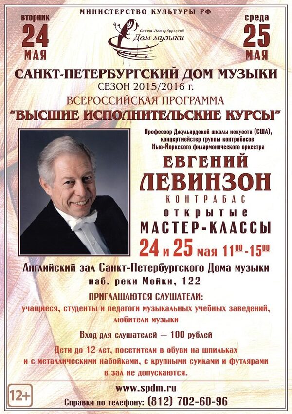 Профессор Джульярда даст уроки молодым контрабасистам24 и 25 мая, во вторник и в среду, с 11.00 до 15.00 Санкт-Петербургский Дом музыки приглашает на открытые мастер-классы знаменитого контрабасиста Евгения Левинзона. ...