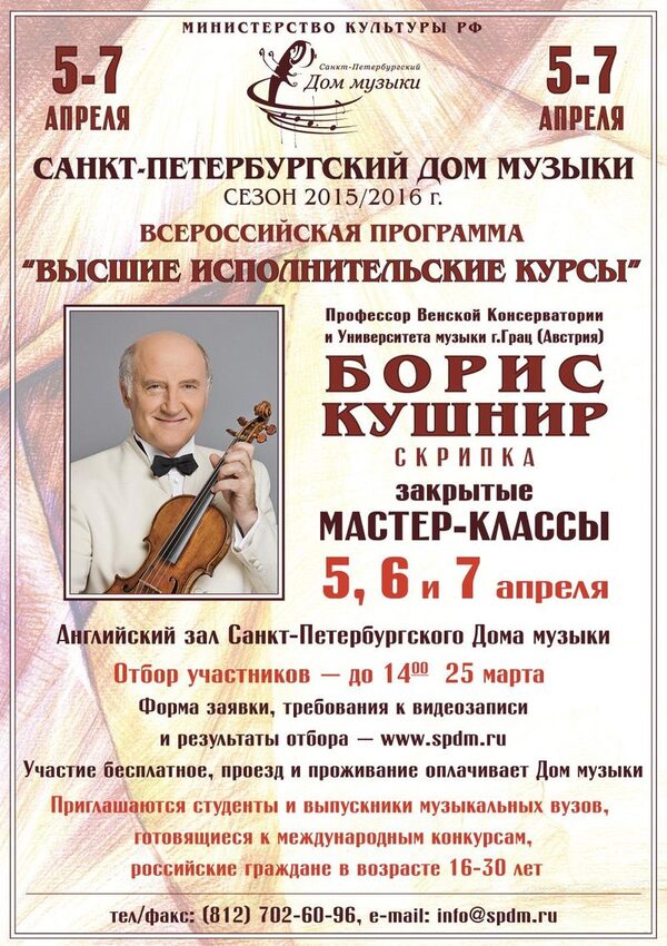 Борис Кушнир даст бесплатные мастер-классы для молодых скрипачей5, 6 и 7 апреля в Санкт-Петербургском Доме музыки пройдут закрытые для публики мастер-классы профессора Венской консерватории и Университета музыки Граца (Австрия) Б ...