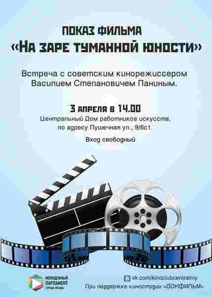 Киноклуб молодых парламентариев ЦАО устраивает уникальный показ фильма "На заре туманной юности" и встречу с советским кинорежиссером Василием Степановичем Паниным3 апреля в 14.00 приглашаем всех ценителей отечественного кино и поэзии в Центральный Дом работников искусств, по адресу Пушечная ул., 9/6с1. Молодые парламентарии ...