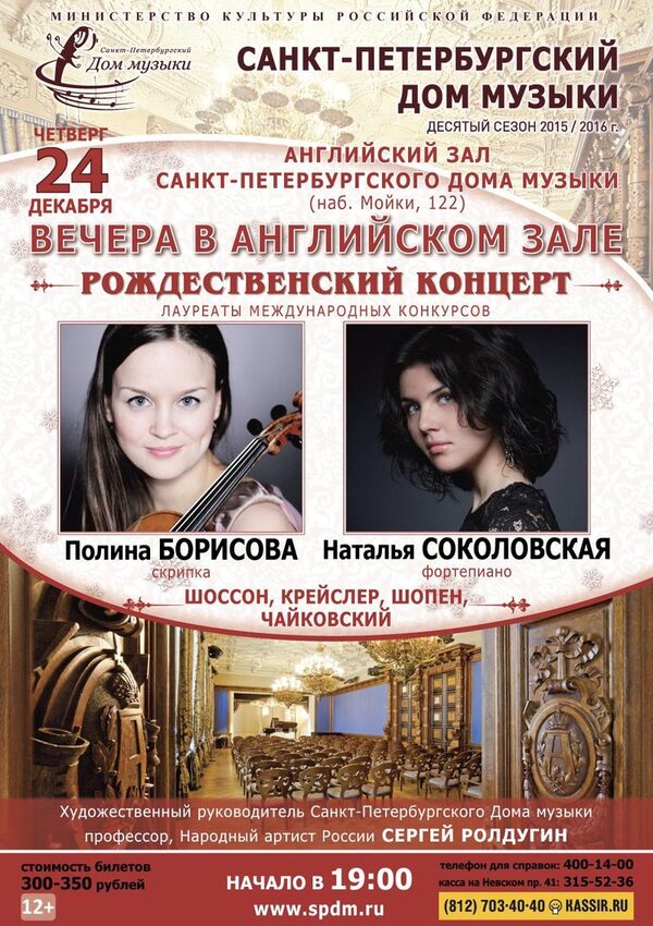 Вальсы, полонезы, мазурки — Рождество в Доме музыки24 декабря, в четверг, в 19:00 в Санкт-Петербургском Доме музыки (наб. Мойки, 122) состоится Рождественский концерт «Вечера в Английском зале». Выступят молодые соли ...