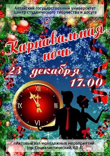 В рамках закрытия Года литературы в АлтГУ организуют «Карнавальную ночь»23 декабря в Алтайском государственном университете состоится торжественное мероприятие, посвященное закрытию Года литературы в России и наступающему празднику – Нов ...
