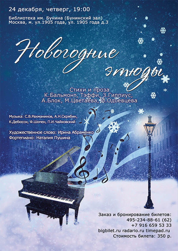 Новогодний подарок москвичам – праздничный концерт24 декабря в 19:00 в библиотеке имени Бунина состоится вечер-настроение «Новогодние этюды». В программе стихи и проза Марины Цветаевой, Тэффи, Константина Бальмонта, ...