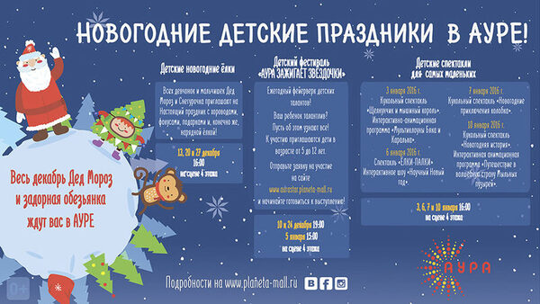 «АУРА» подарит новогоднее настроение малышам и их родителям!Специальная новогодняя программа для детей будет проходить в АУРЕ в декабре текущего года и в новогодние праздники - с 3 по 10 января. Посетителей ждут яркие спекта ...