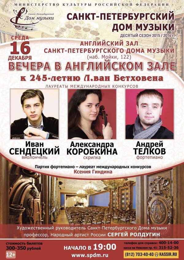 Юбилей Бетховена отметят «Вечерами в Английском зале»16 декабря, в среду, в 19:00 Санкт-Петербургский Дом музыки приглашает на концерт из цикла «Вечера в Английском зале». К 245-летию Людвига ван Бетховена выступят мол ...