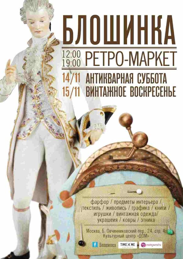 X Ретро - маркет "Блошинка"12:00-19:00 14 ноября – Антикварная суббота 15 ноября – Винтажное воскресенье Москва Большой Овчинниковский переулок, 24, стр.4 Культурный центр «ДОМ» Ретр ...