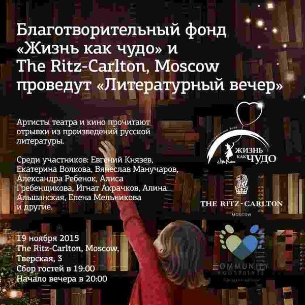 Благотворительный Фонд «Жизнь как чудо» совместно с «The Ritz-Carlton, Moscow» проведут "Литературный вечер"!19 ноября в Бальном зале одного из роскошных отелей Москвы соберутся артисты театра и кино, чтобы прочитать отрывки из любимых произведений русской классики. Вечер с ...