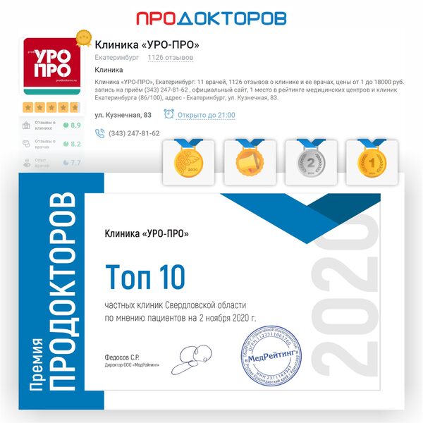 Клиника «УРО-ПРО» – победитель всероссийской медицинской премии «ПроДокторов–2020»Медицинский центр «УРО-ПРО» вошёл в десятку лучших клиник Свердловской области по версии авторитетного медицинского портала России «ПроДокторов», став одним из побед ...