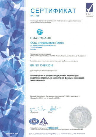 Компания «Ниармедик» получила сертификаты соответствия производства медицинского изделия ESVIEF требованиям EN ISO 13485 и EN ISO 9001Компания «Ниармедик» подтвердила соответствие своей системы менеджмента качества на производство медицинского изделия ESVIEF (системы для выделения стромально-васкул ...