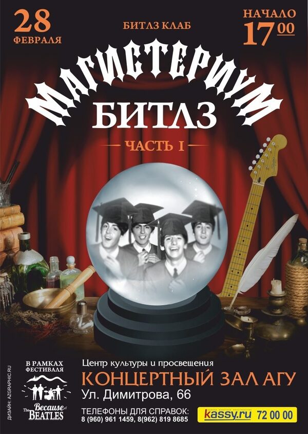 На сцене концертного зала АлтГУ представят уникальный проект «Магистериум Битлз»Центр культуры и просвещения Алтайского государственного университета приглашает жителей и гостей Барнаула стать участниками уникального мероприятия под названием «М ...