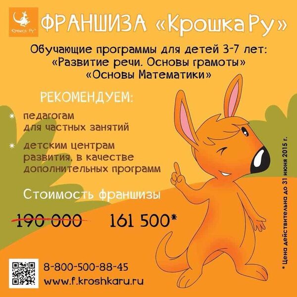 Новинка! Кабинет "Крошка Ру"Мы презентуем новый формат франшизы компании "Крошка Ру"! КАБИНЕТ «Крошка Ру» — отдельная франшиза на обучающие программы «Развитие речи. Основы грамоты» и «Основ ...