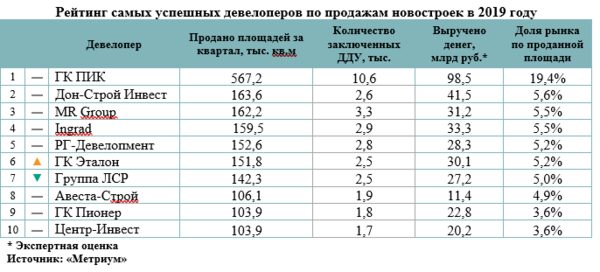 «Метриум»: Рейтинг самых успешных девелоперов жилья в Москве 2019На десять лидирующих по продажам столичных застройщиков приходится 62% всего реализованного в 2019 году московского первичного жилья, подсчитали эксперты «Метриум». ...
