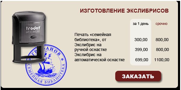 Копирыч – профессиональное изготовление экслибрисов в МосквеДорогие семейные фолианты или просто популярные книги, переходящие из рук в руки, требуют отличительного знака принадлежности к личной библиотеке или библиотеке фирм ...
