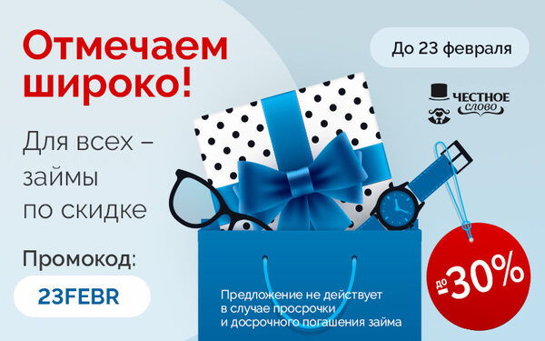 МФК «Честное слово» защитит от безденежья в честь 23 февраля!12.02.2021 – Москва. Ко Дню защитника Отечества МФК «Честное слово» подарит клиентам 5 дней бесплатных займов Чтобы 23 февраля прошло в праздничной атмосфере, онла ...