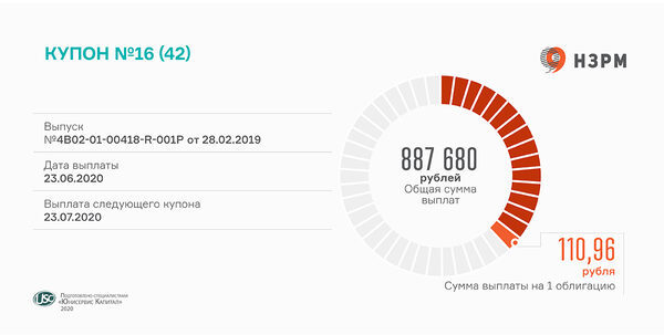 «НЗРМ» выплатил инвесторам доход за 16 купонный периодНа выплату купона компания перечислила в НРД денежные средства в размере 887 680 рублей. Одна облигация данного выпуска номиналом 10 ты ...