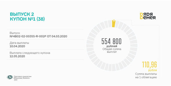 Состоялась выплата первого купона по второму выпуску «Дядя Дёнер»Инвесторы получают ежемесячный доход по ставке 13,5% годовых, что в денежном выражении составляет 554,8 тысяч рублей, а в пересчете на одну ...