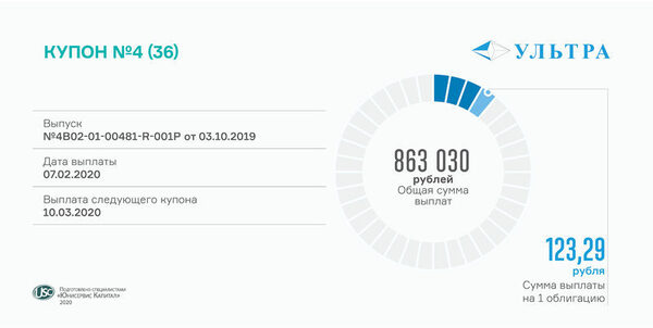 «Ультра» выплатила четвертый купонКомпания перечислила в НРД более 850 тыс. рублей купонного дохода по биржевым облигациям (RU000A100WR2). Купон выплачивается ежемесячно по ст ...