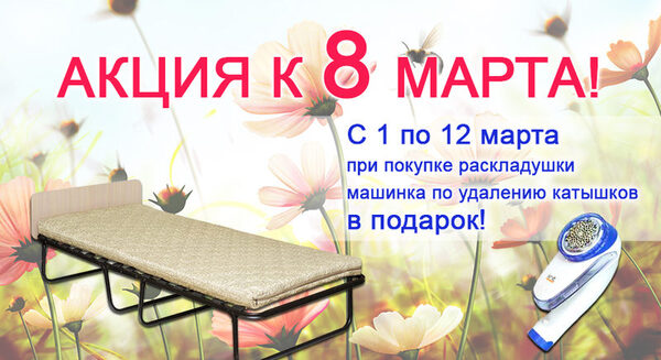 Акция к 8 Марта! При покупке раскладушки в период с 1 - 12 марта - машинка для удаления катышков в подарок!Каждый, кто решит совершить покупку раскладушки на сайте компании «Ключ Уюта» с 1 по 12 марта, получит машинку для удаления катышков в подарок. Такая возможность поз ...