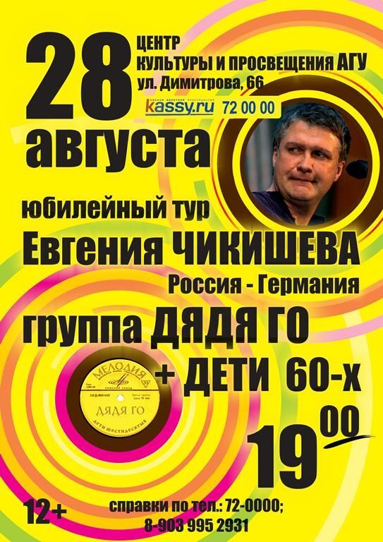 Юбилейный тур «легенды сибирского рока» Евгения Чикишева стартует в АлтГУЦентр культуры и просвещения Алтайского государственного университета готовится к проведению премьерного концерта большого тура известного автора-исполнителя, гитари ...
